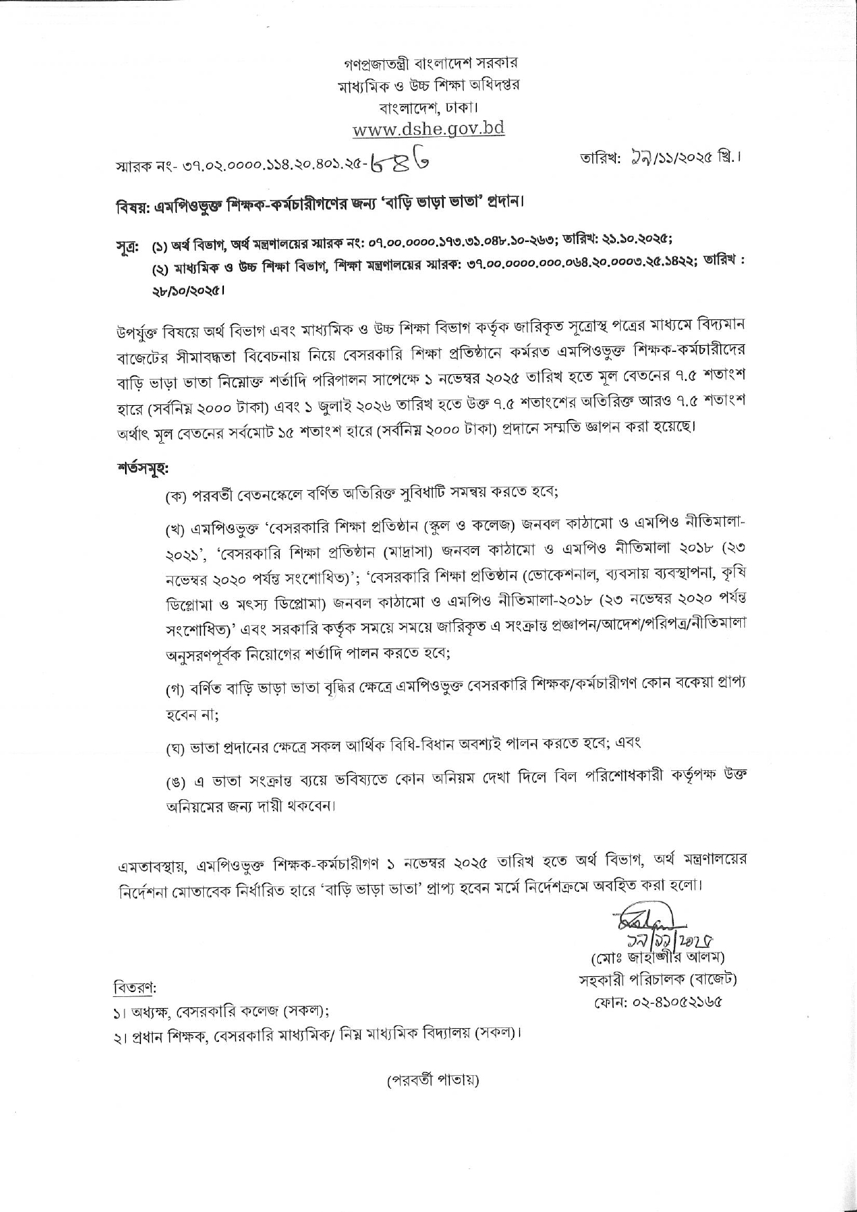 এমপিওভু্ক্ত শিক্ষকগণের বাড়ী ভাড়া ভাতা
